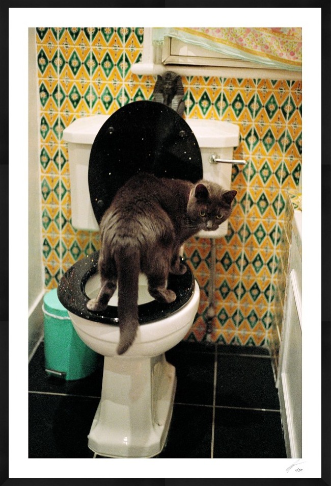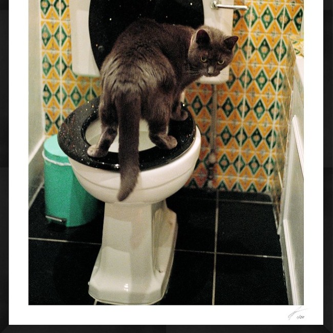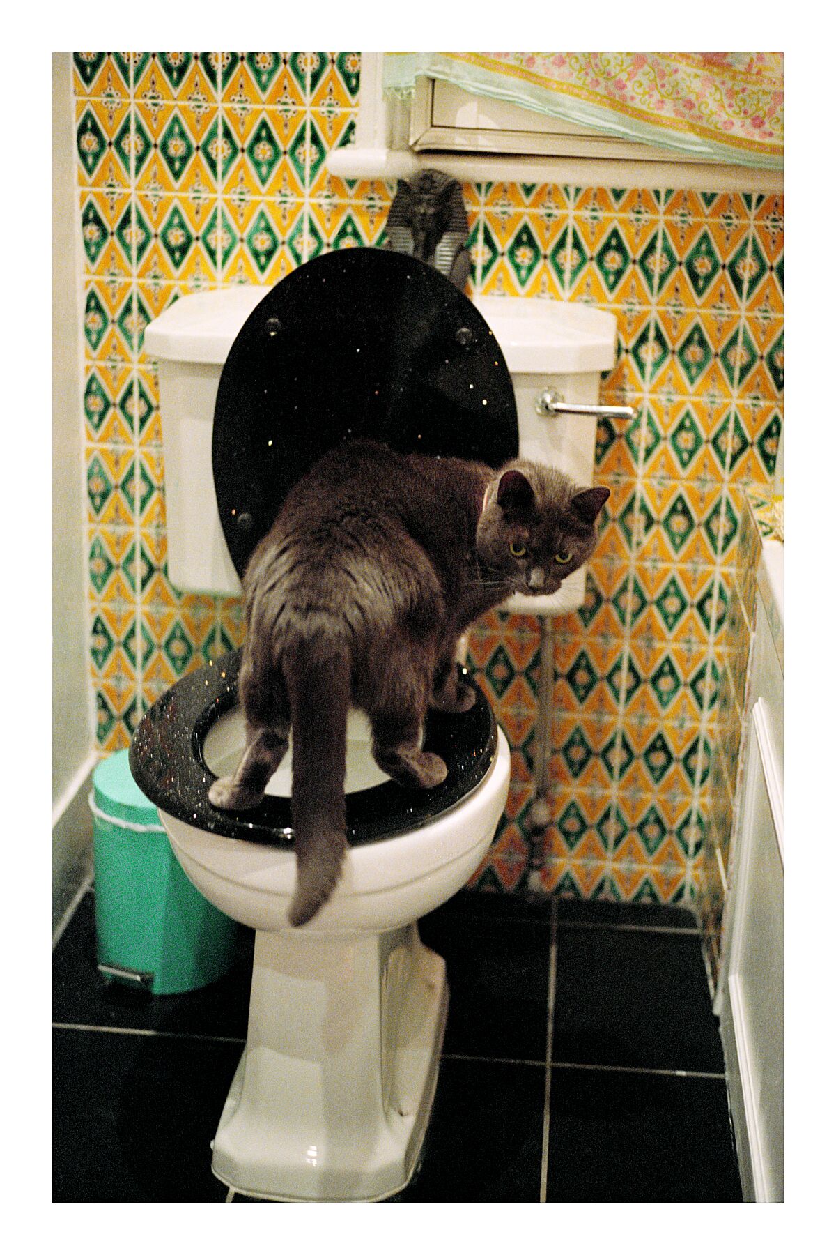 Walking up the stairs to my room, Vinnie the cat was there, standing on the toilet, staring straight at me.