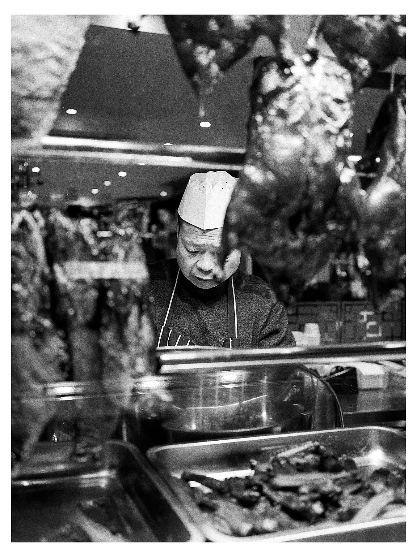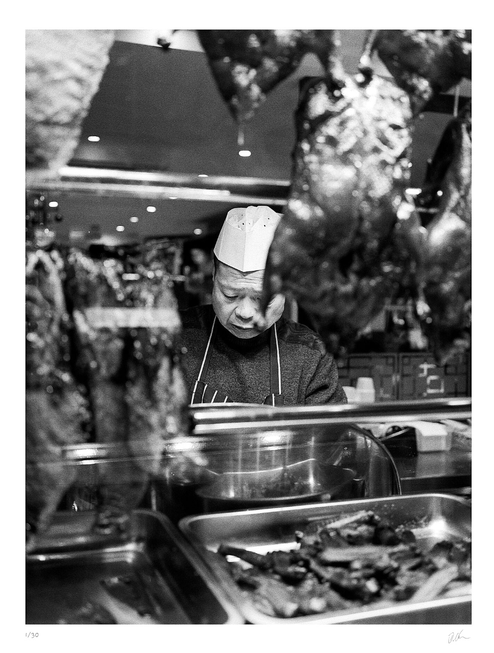 Behind a row of glistening ducks, the chef moves with the practiced grace of a man who has mastered his world. He is framed by the very icons of his trade, his focus entirely consumed by the rhythmic preparation of the day’s roast. In this kitchen, time is measured not by the clock, but by the steady, generational tradition of Cantonese soul food.