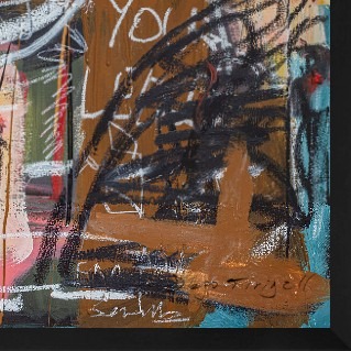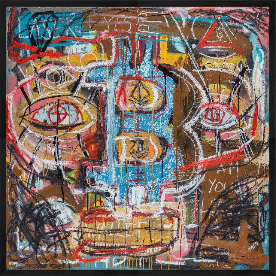 This work plugs directly into the high-voltage world of Bitcoin. Featuring the iconic Bitcoin logo amidst fragmented, intense eyes—glowing with the ‘Laser Eyes’ beam of crypto-believers—the piece crackles with raw energy. Rendered in his signature layered, neo-expressionist style, the cryptic symbols, urgent lines, and fractured mouth evoke the volatile, complex, and often coded nature of the digital currency revolution and the fervent online culture surrounding it.