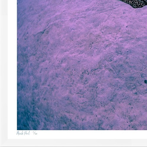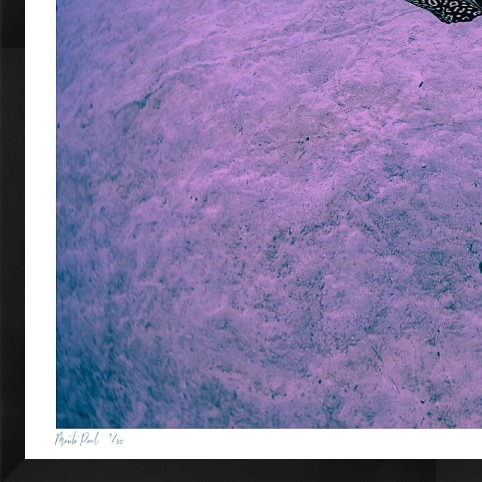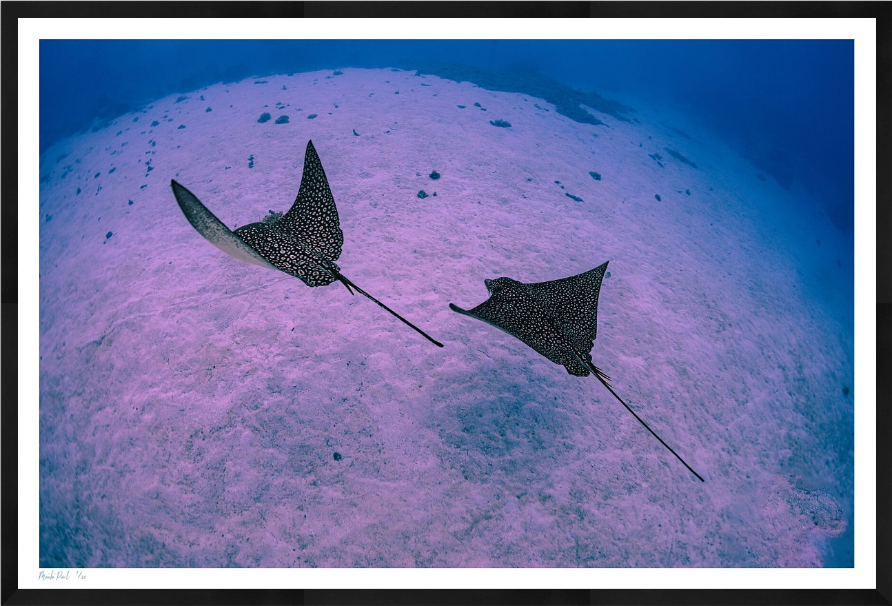 Lunar Lovers transforms Moorea’s spotted eagle rays (Aetobatus ocellatus) into ethereal figures drifting across a seascape that resembles a lunar landscape. Their sleek, dark forms, marked with nature’s signature white spots, float with quiet elegance, suggesting intimacy, memory, and a deep connection to place. The composition evokes both the mystery of the ocean and the otherworldly beauty of a moonlit realm, where grace and stillness reign.