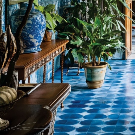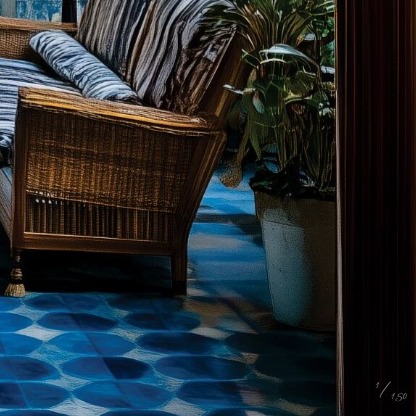 Deep cobalt tones and intricate geometric patterns evoke the tiled courtyards and vibrant souks of Morocco, where colour and architecture create richly layered spaces. Through photography, digital illustration, and collage, Tamara Bacchia transforms these visual traditions into immersive compositions of pattern, light, and atmosphere. Her works merge fragments of ancestral architecture with imagined restorations, composing spaces suspended between memory and reinvention.